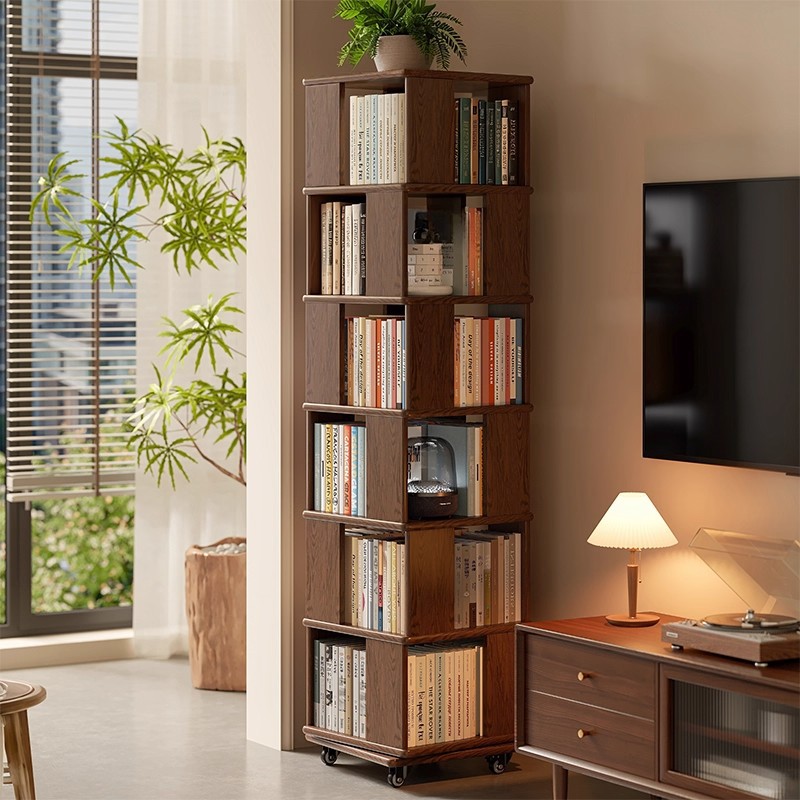 实木旋转书架客厅电视机边柜落地置物架收纳储物架靠墙一体书柜