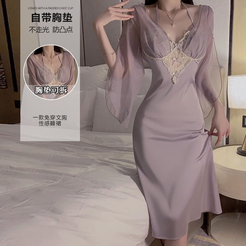 ゲラルオ下着純粋な欲望メッシュレースプラス胸パッドスムーズアイスシルクロングレディースパジャマホームウェアセット 3620
