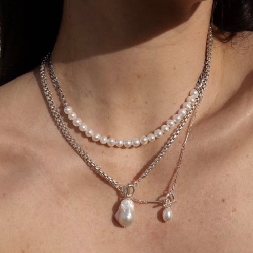 冷淡风简约天然珍珠链条项链女小众设计巴洛克叠戴OT扣金属链项链