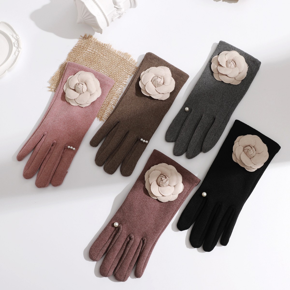 ハンドメイドベルベットのクリームツバキの真珠の指輪は手袋の秋冬の保温とベルベットの手作り手袋の女性insを指します。