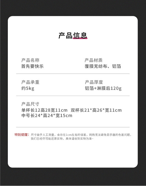 仕様とモデル シングルカップは長さ12cm、高さ28cm、幅11cm、まず幸せな1個、アルミ箔コーティング不織布です。,ダブルカップ長さ21、高さ26、幅11CM、まず幸せな1つ、アルミホイルコーティング不織布,Mサイズ 長さ24 高さ24 幅15CM、まず幸せな1つ、アルミ箔コーティング不織布