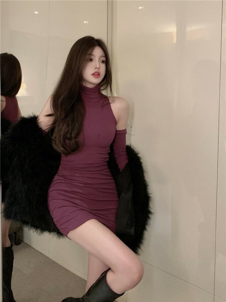 フランス風の雰囲気のギャル風のセクシーな半高襟のワンピースの女性の秋冬のしわの修身は腰を収めて底を打ってお尻のスカートを包みます。