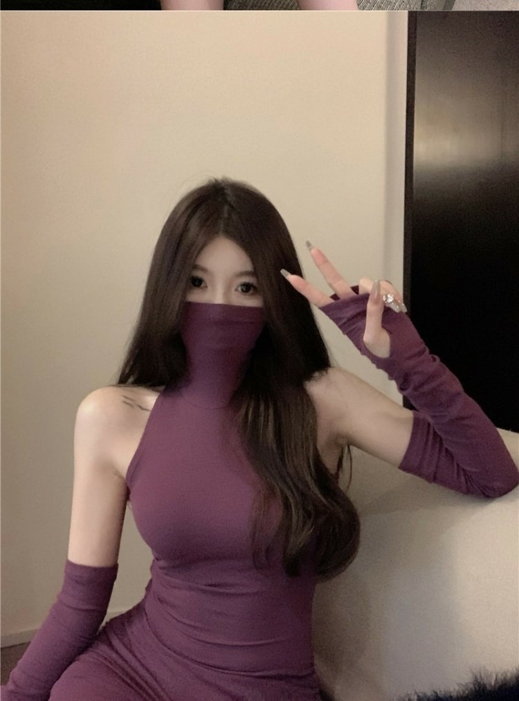 ギャルの低い胸のvネックの長袖のワンピースの女性の早い春の新型のネットの赤い紫色の弾力性のセクシーなa字のお尻のスカート
