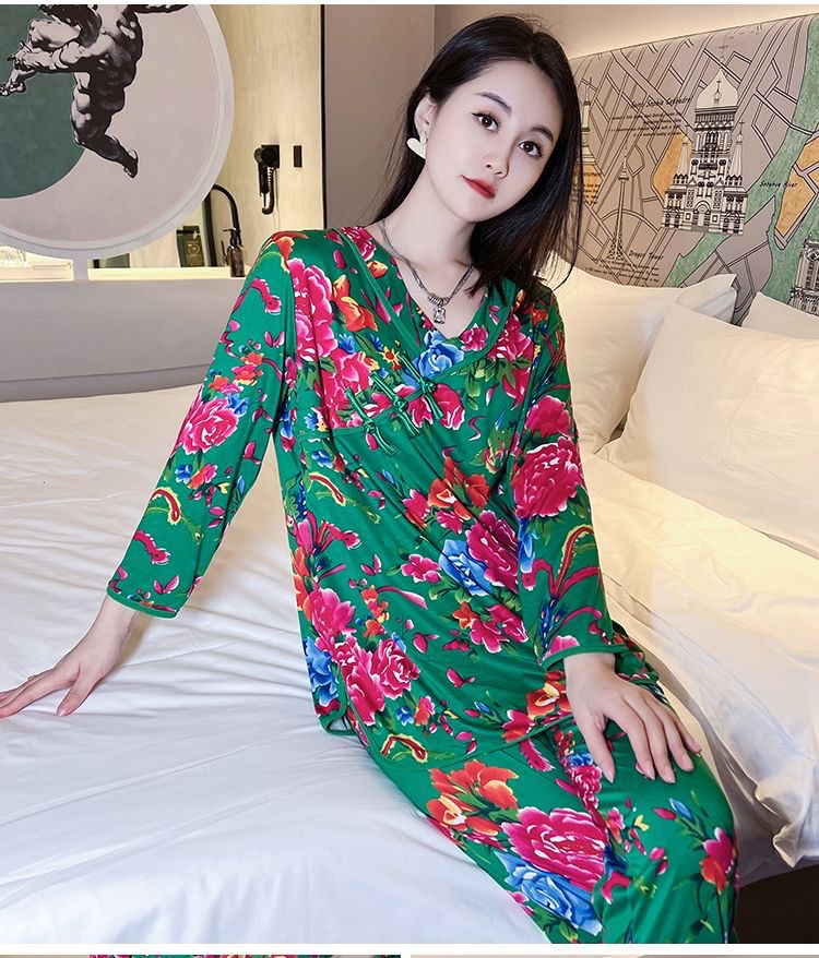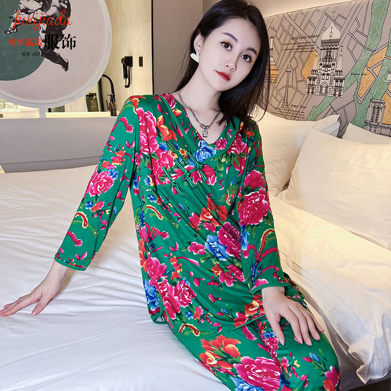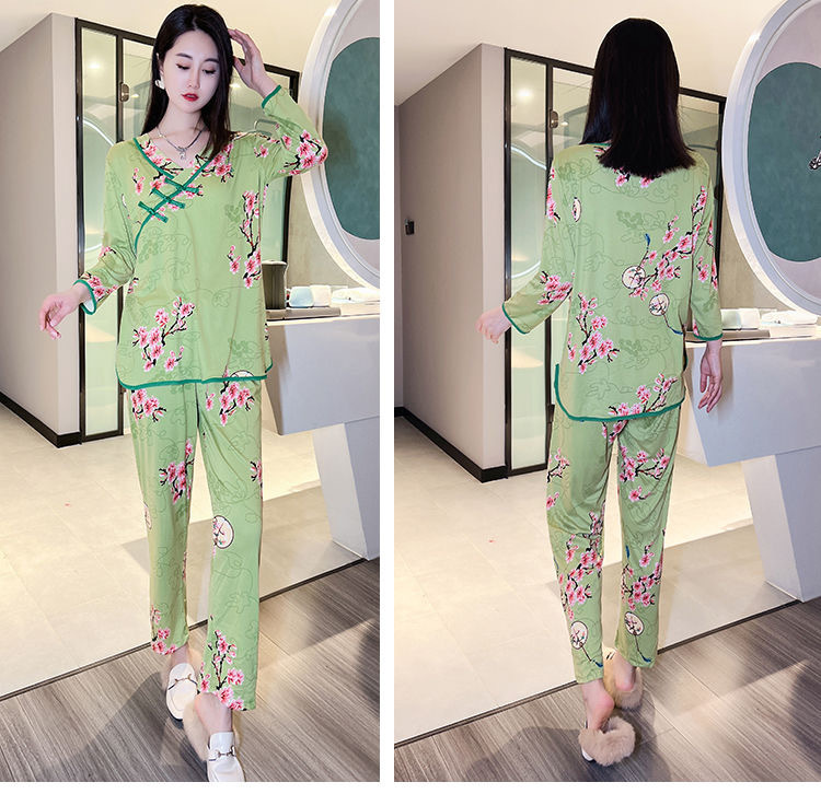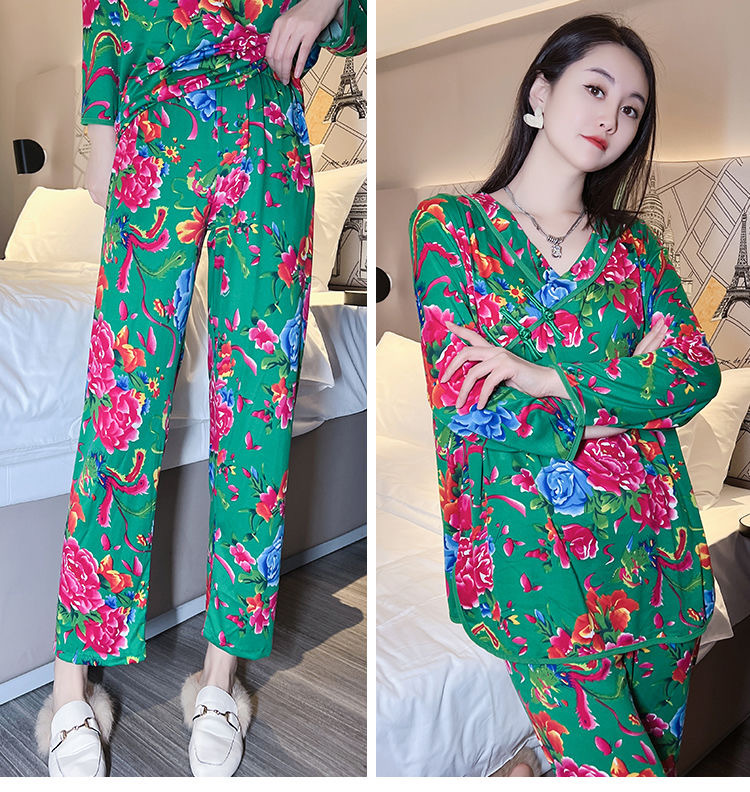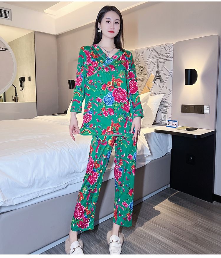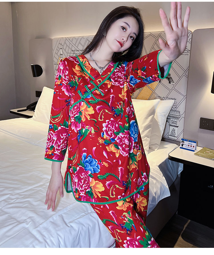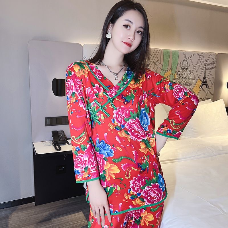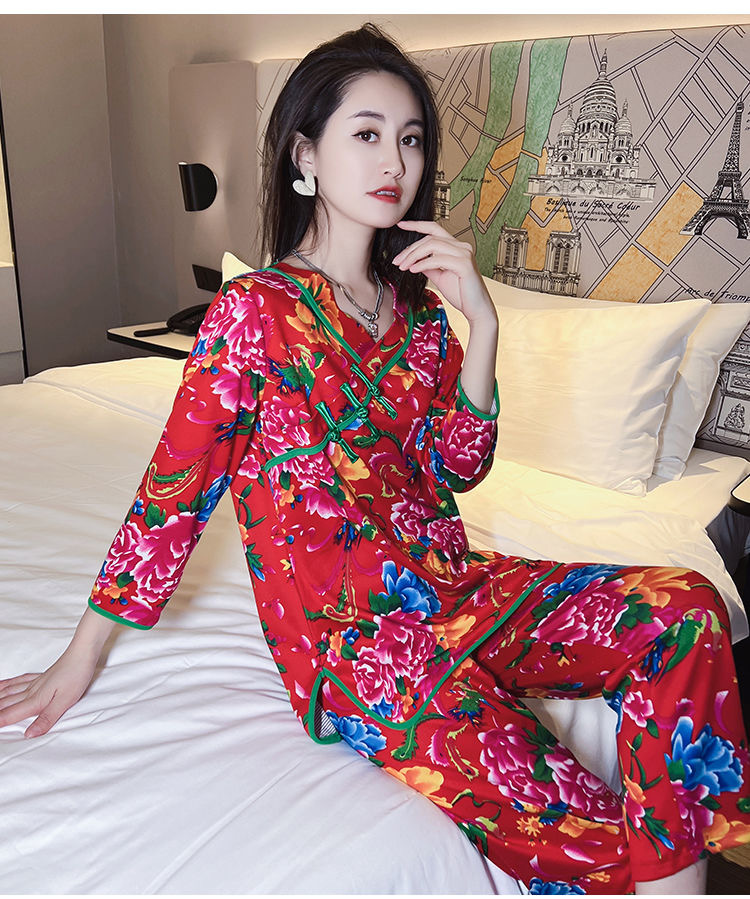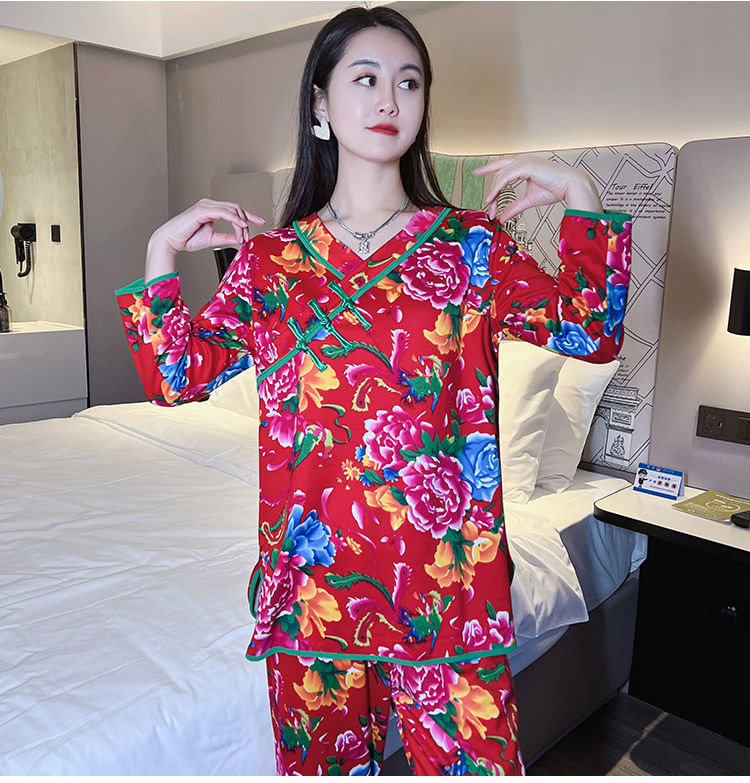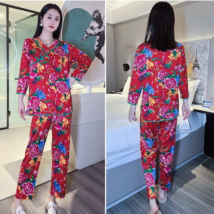 秋冬新作中国風プリント長袖ホームウェア東北大花ネットレッドins風ゆるいパジャマ女性スーツ