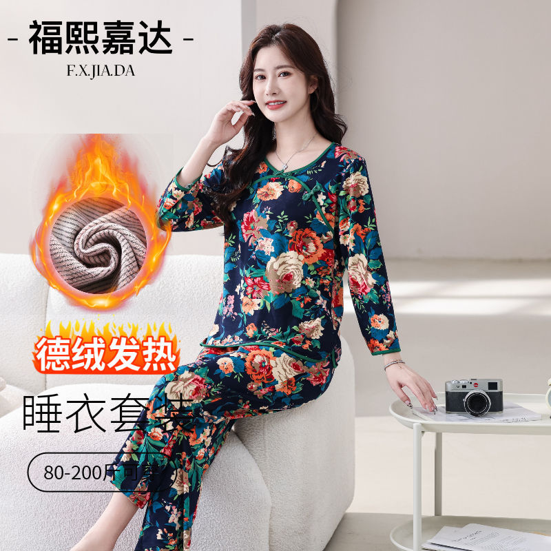 中国風東北大花パジャマ女性秋冬モデル徳絨毛保温ゆるい大サイズの家庭服セットは外出できる
