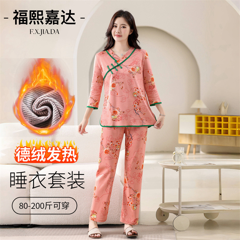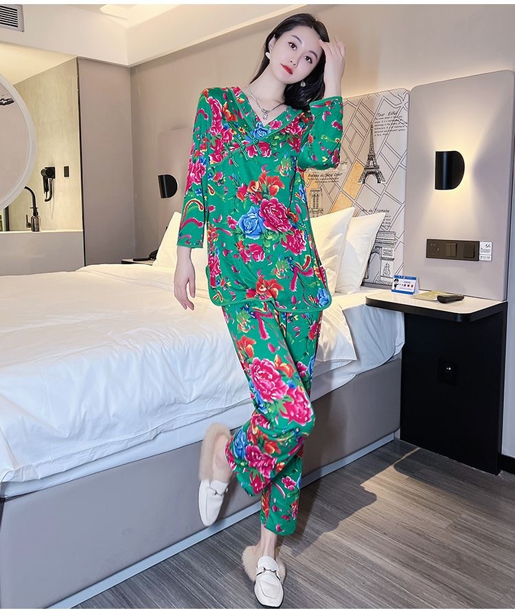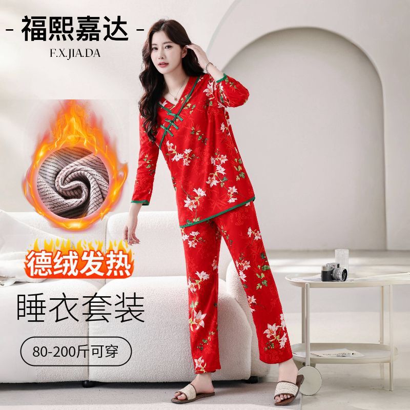 ネット紅民族風徳絨毛保温女性パジャマファッション東北大花中国風国風ゆるい家庭服セット
