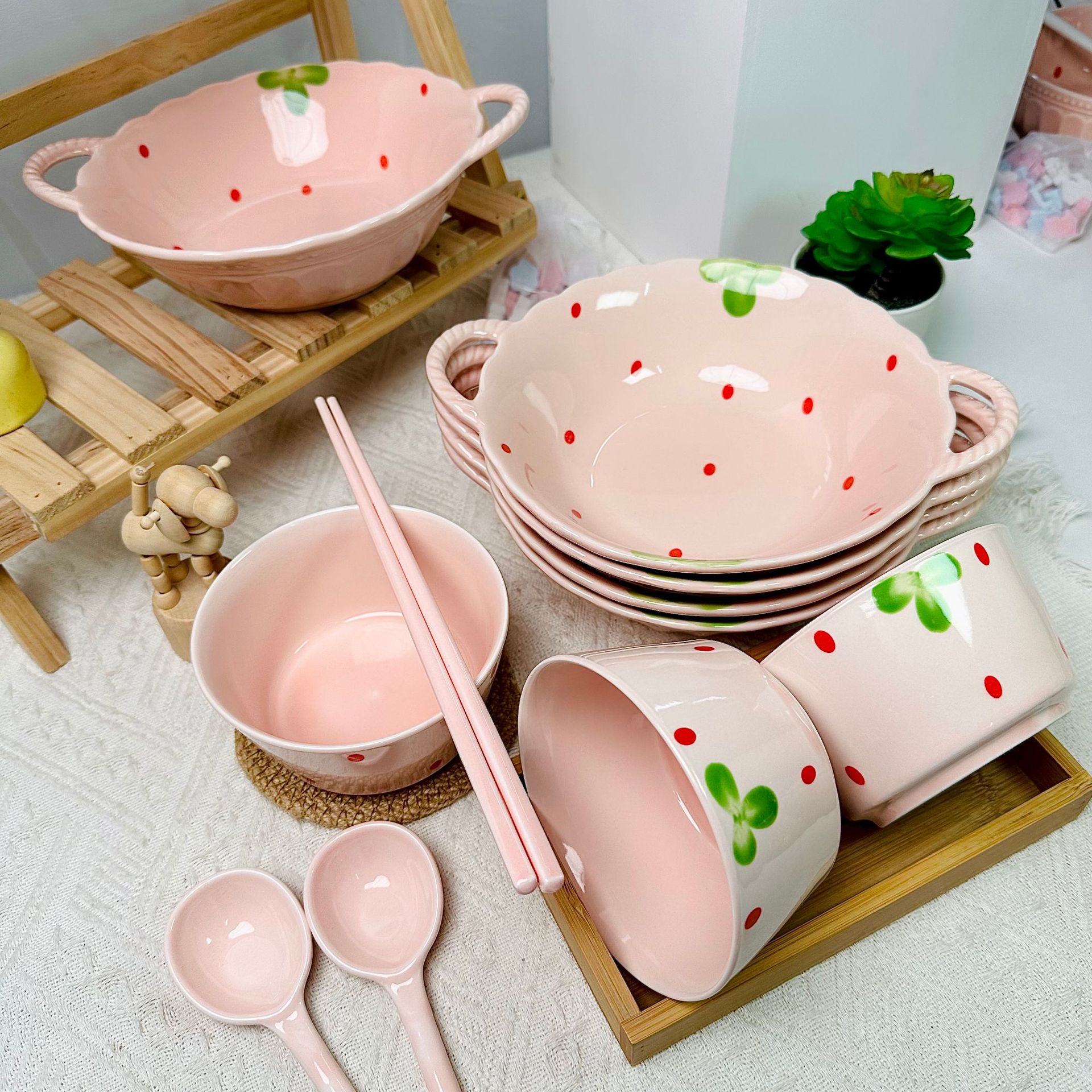 いちご波点陶磁器食器釉薬下彩家庭用大セット陶磁器ご飯碗魚皿箸セット
