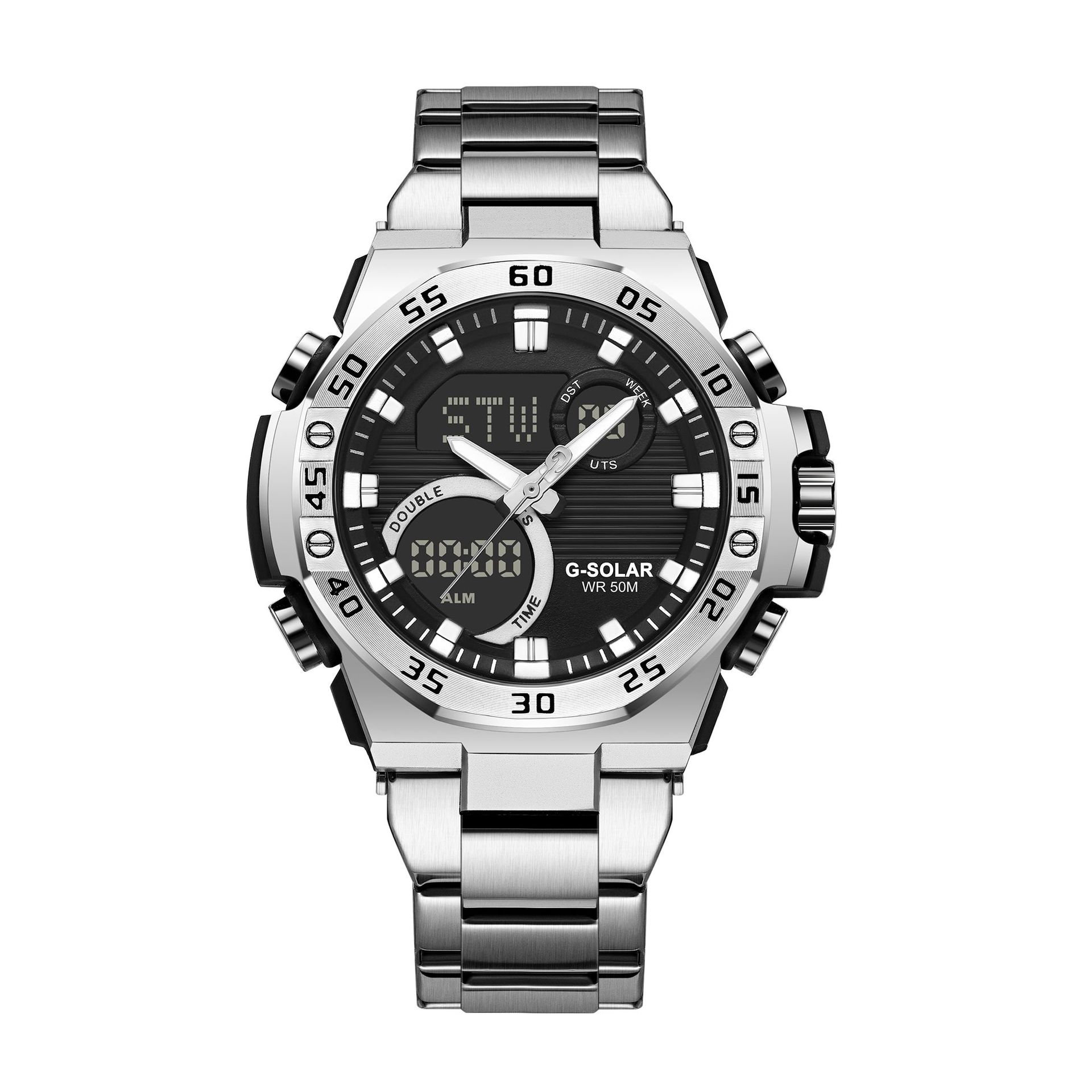 光能鋼鉄の心ビジネス男性鋼帯多機能電子石英双顕運動夜光腕時計対外貿易バッチ
