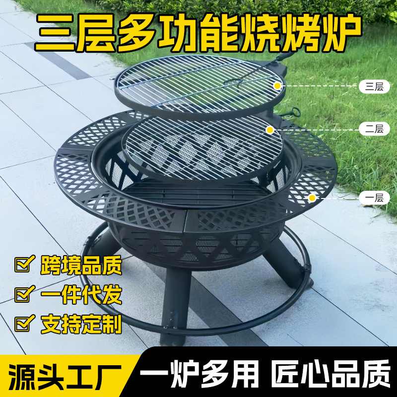 户外圆形烧烤炉3层烤架围炉煮茶的炉子全套户外庭院烤炉3层烧烤架
