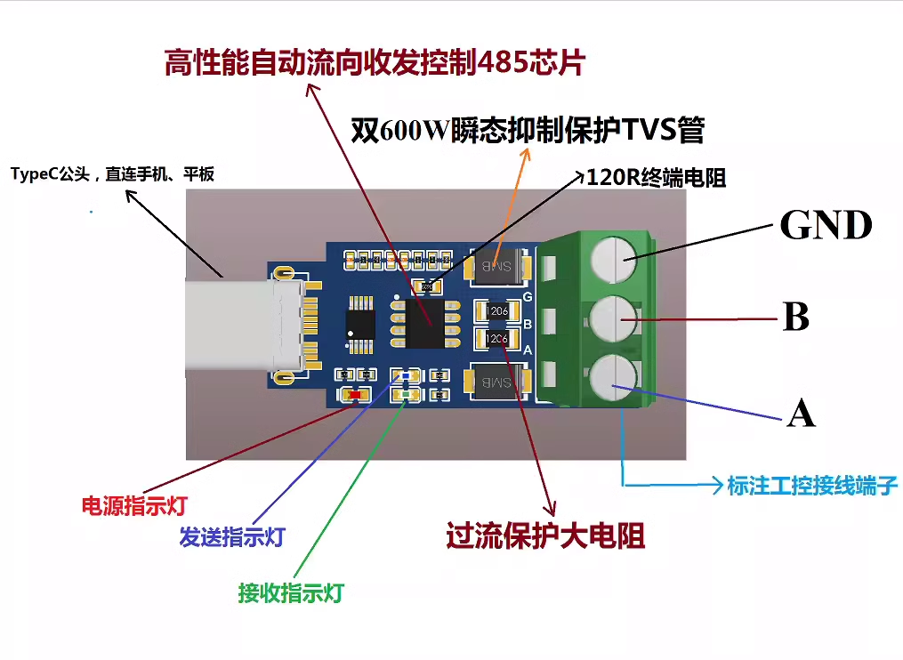 2、具有RXD、TXD、电源三个LED指示灯,串口输入保护;