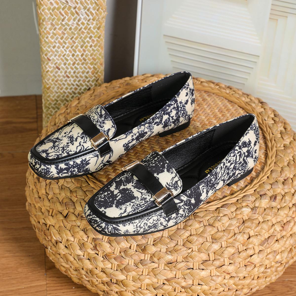2025年欧米向け新作、浅口バックル付きフラットシューズ、スクエアトゥ、レディースシューズ、大きいサイズ、柔らかい履き心地