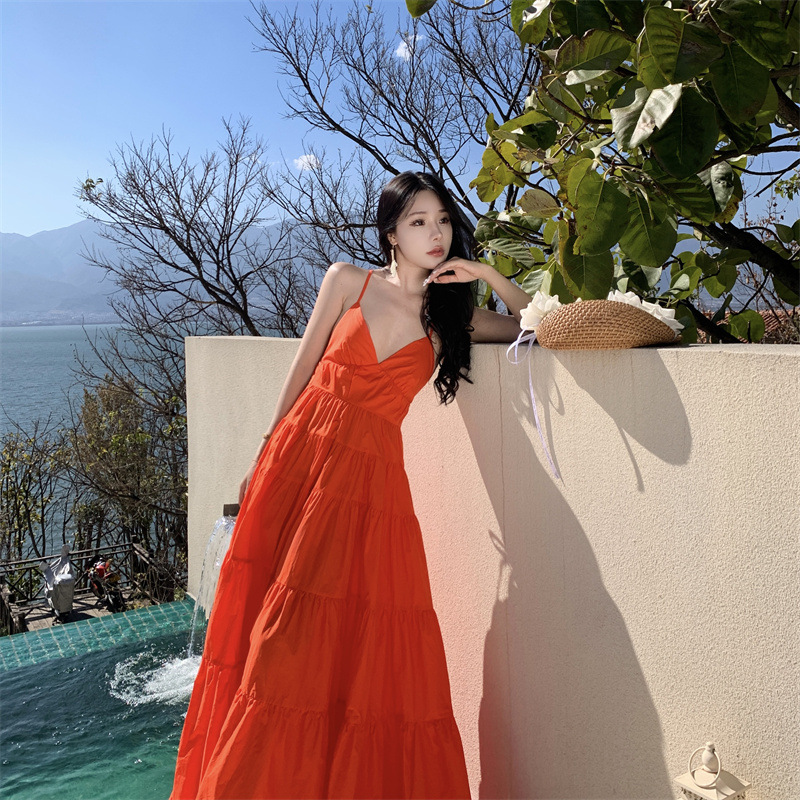 フレンチレトロハイエンド気質ホリデーロングスカートウエスト妖精スカートアイランド着用サスペンダードレスビーチスカート