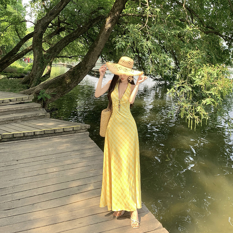 フレンチスタイルの背中見せセクシーな黄色のサロペットワンピース、夏の新作サロペットワンピース、ウエストシェイプロングワンピース、島のリゾートワンピース