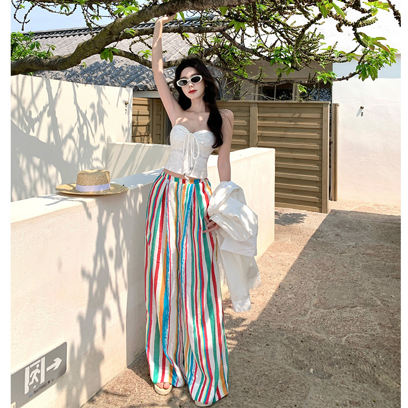 実際に休暇を過ごした薄い腰の高いズボンの虹のストライプのズボンの広い足のズボンのひもは胸の短い上着を拭きます。