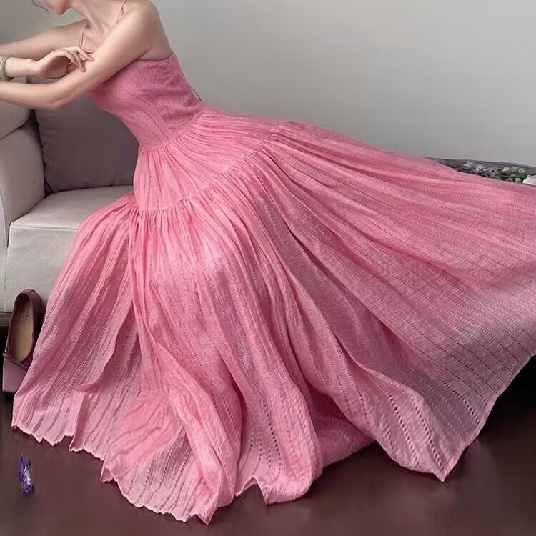 フランス式のヘボン風のピンクの美背のワンピースの女性の夏のデザインは腰を収めて肩のしわを現します。