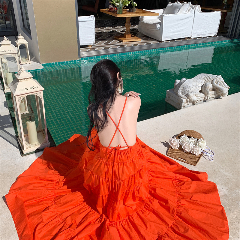 スター同型の露背サスペンダースカート海辺のリゾート風ビーチスカート高腰純色大振りワンピース女性夏