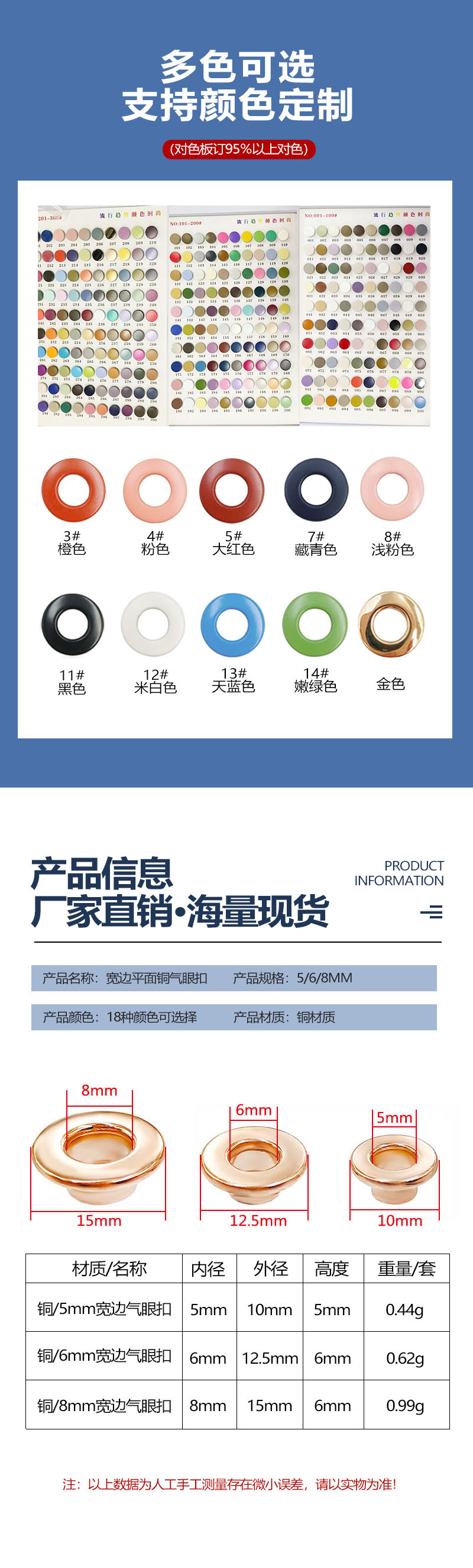 カラー 5mm幅平面銅鶏眼ボタンケース,6mm幅平面銅鶏眼ボタンケース,8mm幅平面銅鶏眼ボタンケース