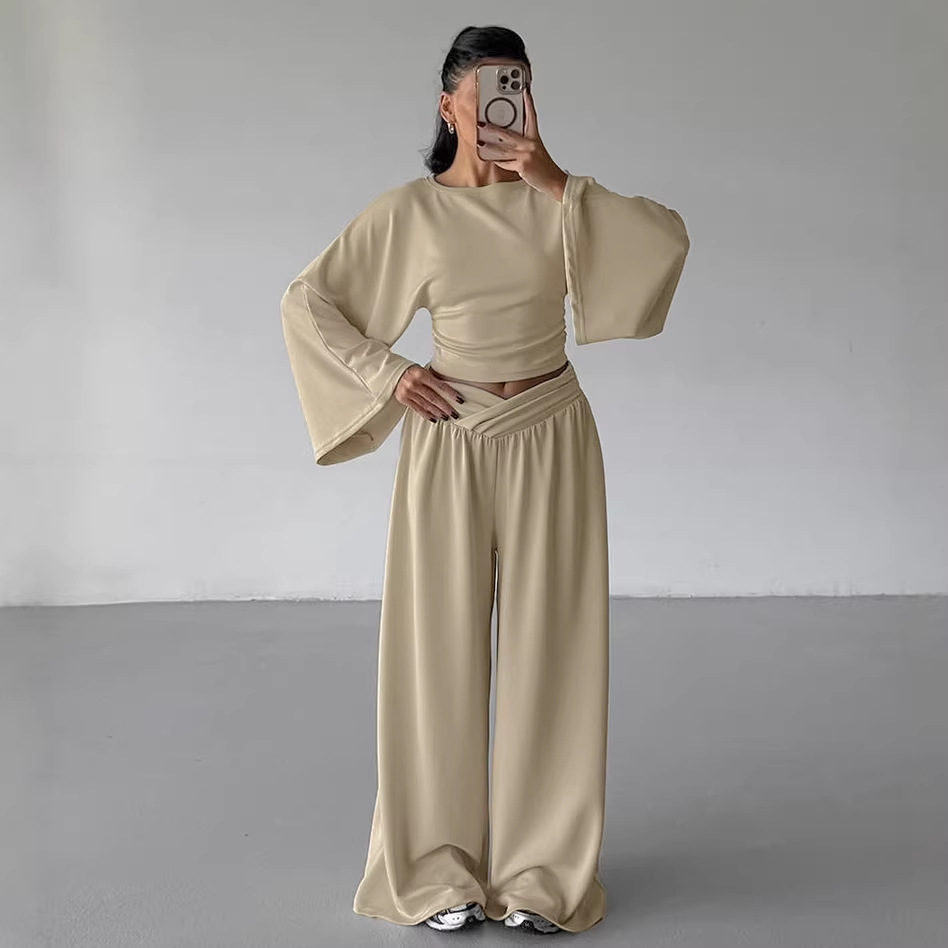 欧美跨境秋冬长袖休闲套装女收腰喇叭袖上衣拖地裤气质时尚两件套