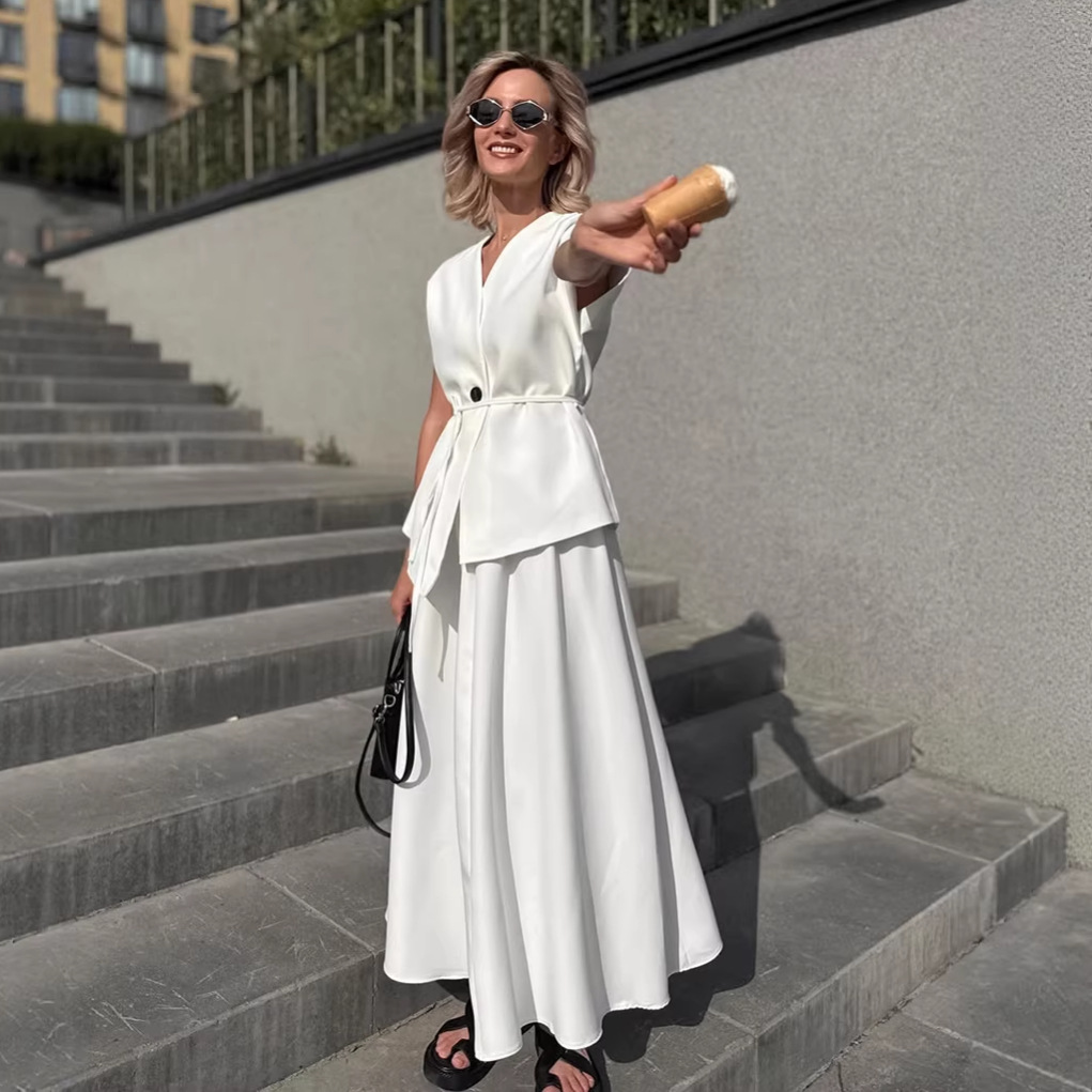 欧美白色气质收腰系带套装女高级感一粒扣短袖v领上衣A字裙两件套