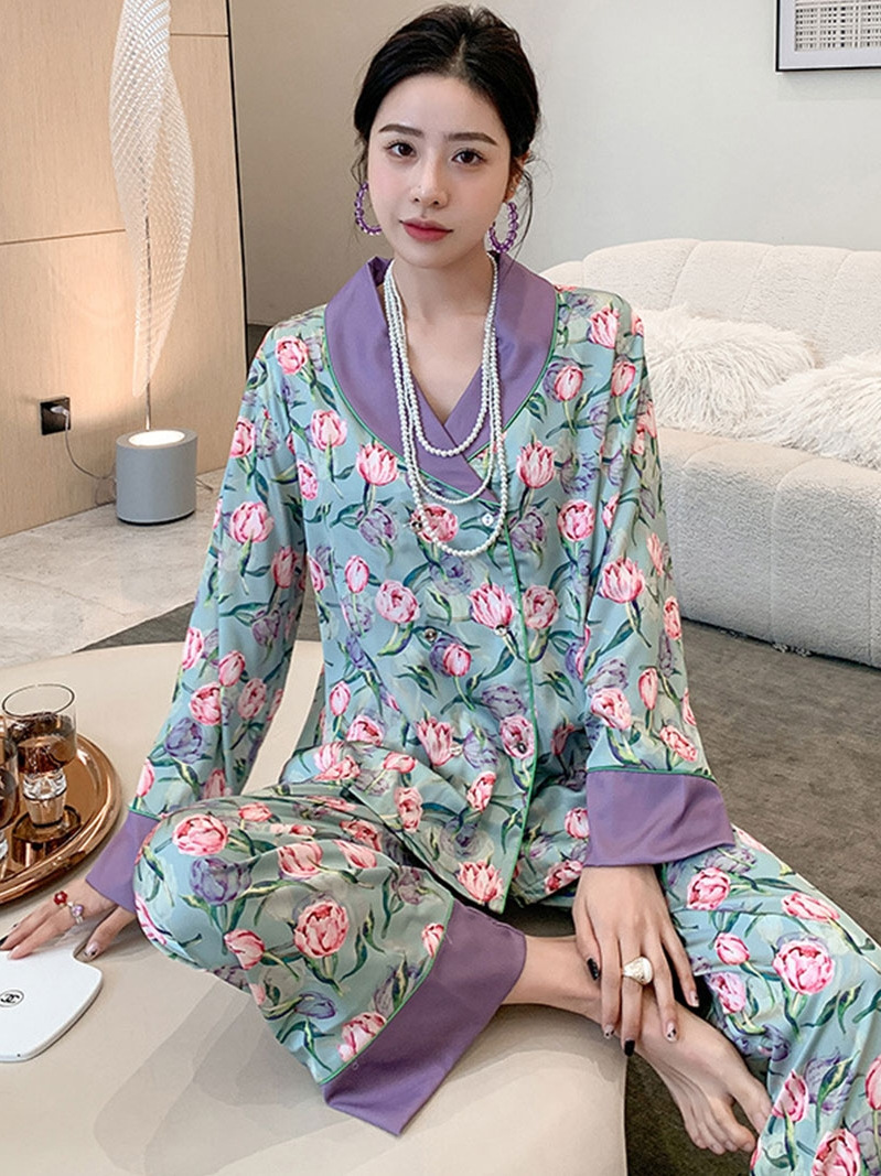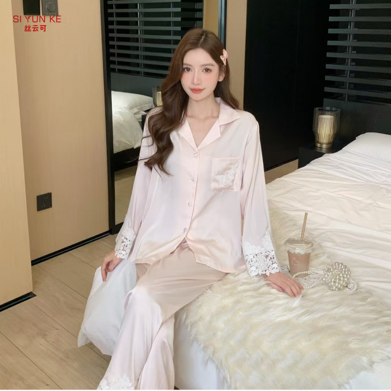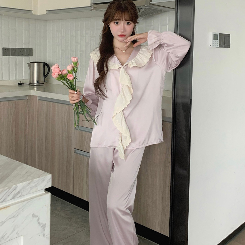 長袖のズボンのパジャマの女性は2025春と秋に襟をひっくり返します。