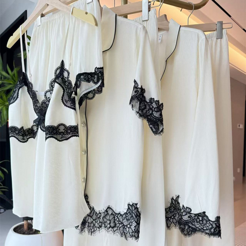 2024新型パジャマ女性夏氷糸薄い半袖サテン少女甘美で贅沢なフランスの家庭服セット