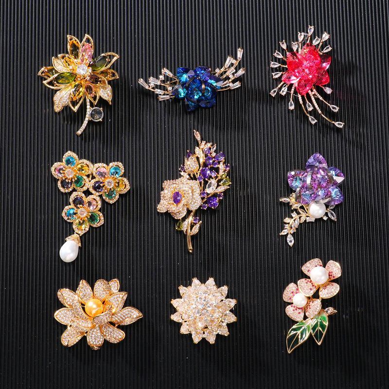 ジルコンシリーズブローチ銅飾り高級気質女性服アクセサリー植物花水晶飾りジルコニアブローチ