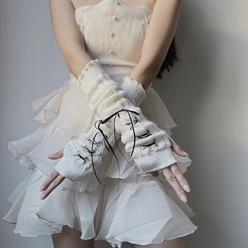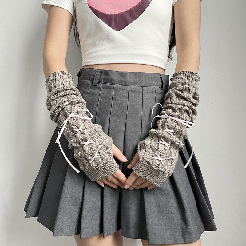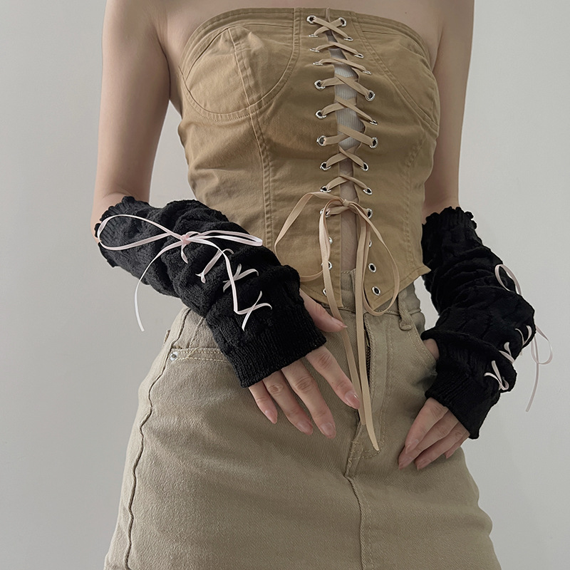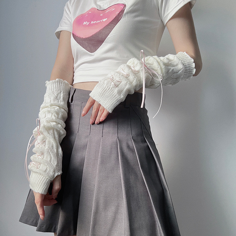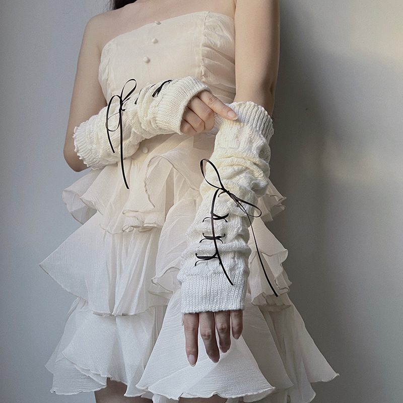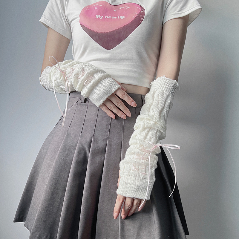 かわいいLolita蝶結びニット手袖指漏れ手袋女子ギャル袖カバー甘いバレエ風腕カバー