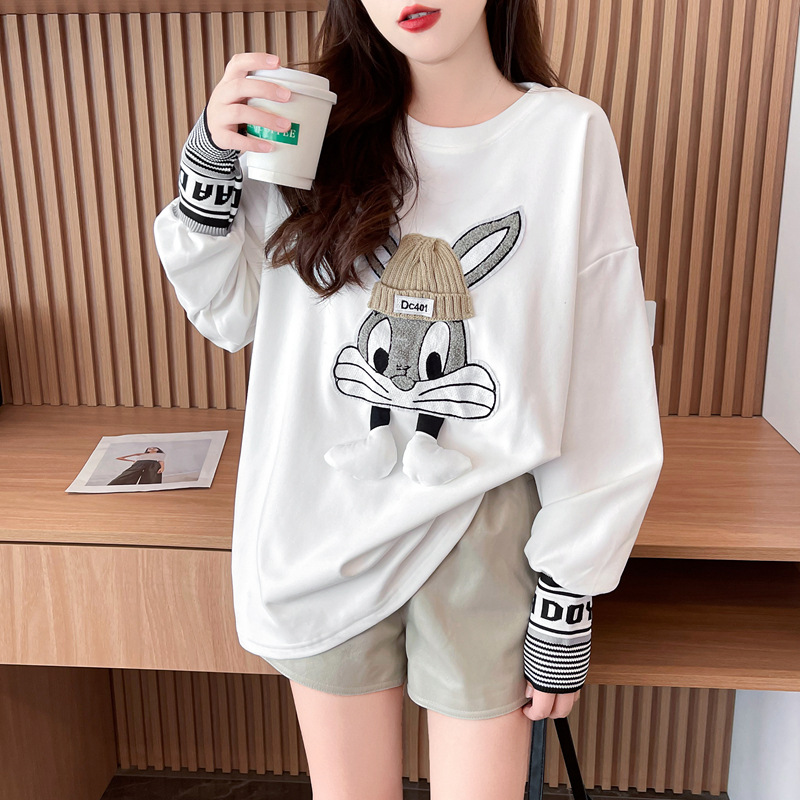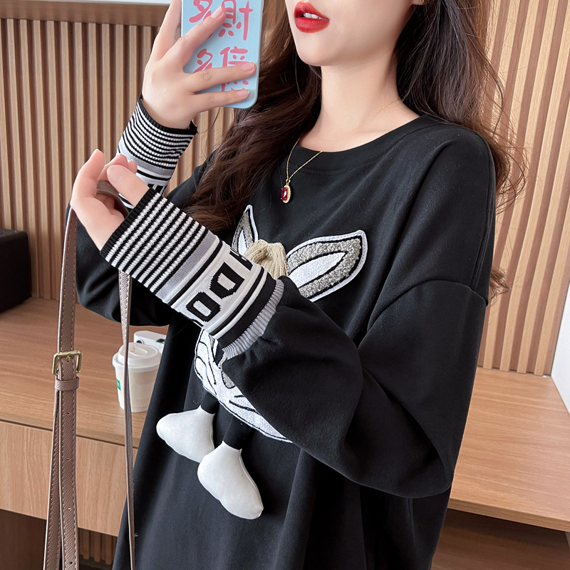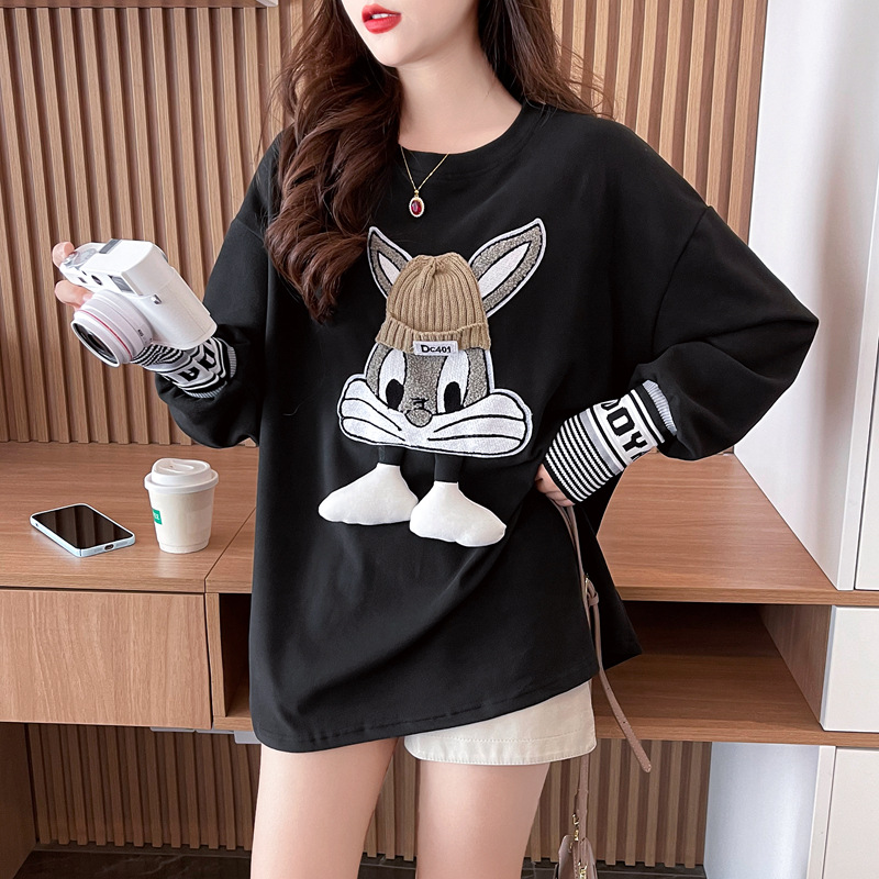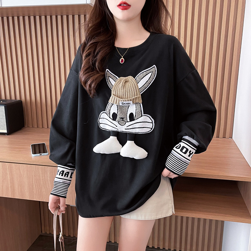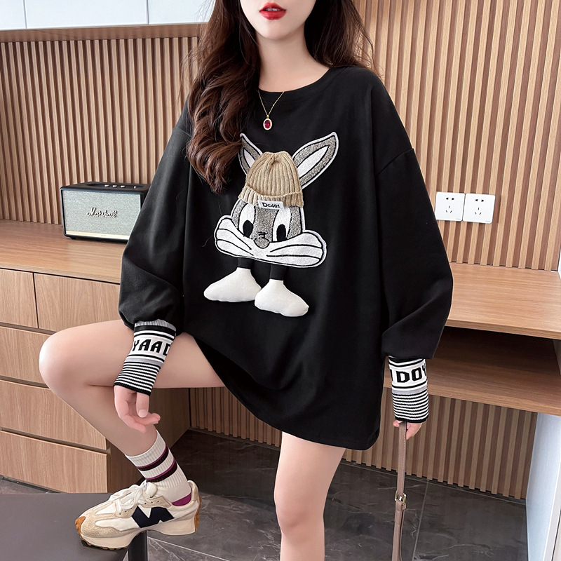 クロスボーダーtシャツの女性保温丸首長袖アニメのゆったりした大きいサイズの厚い偽の2つのボトムの女性
