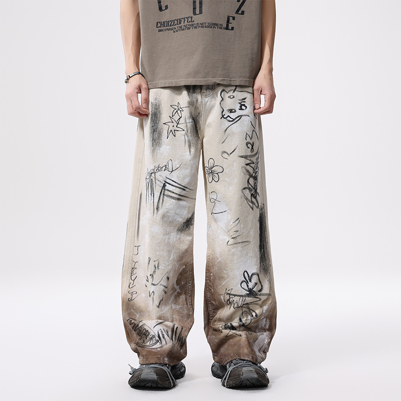韓国版のデザイン感純綿の白いストレートジーンズの男性のファッションの高い街の広い足に合わせて、長いズボンを引きずっています。