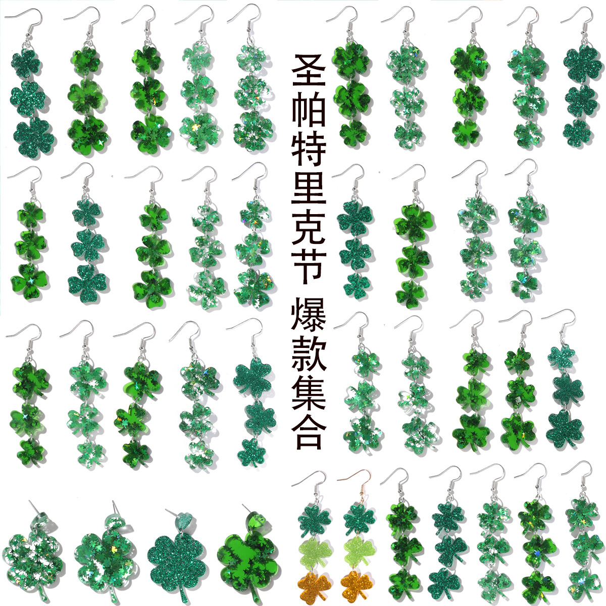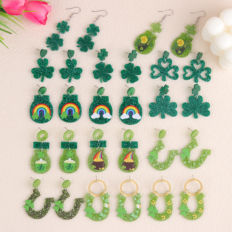 亚马逊跨境欧美节日闪粉圣帕特里克节四叶草三叶草亚克力女士耳坠