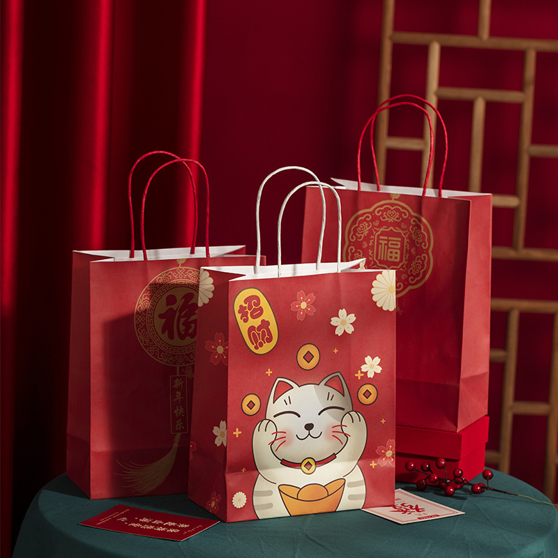 旧正月の新しいクラフト紙袋のお祝いの赤いプレゼント袋の現物卸売り国風プリントクラフト紙の手提げ袋
