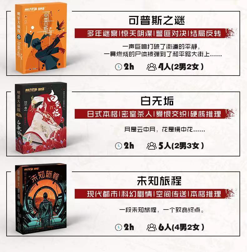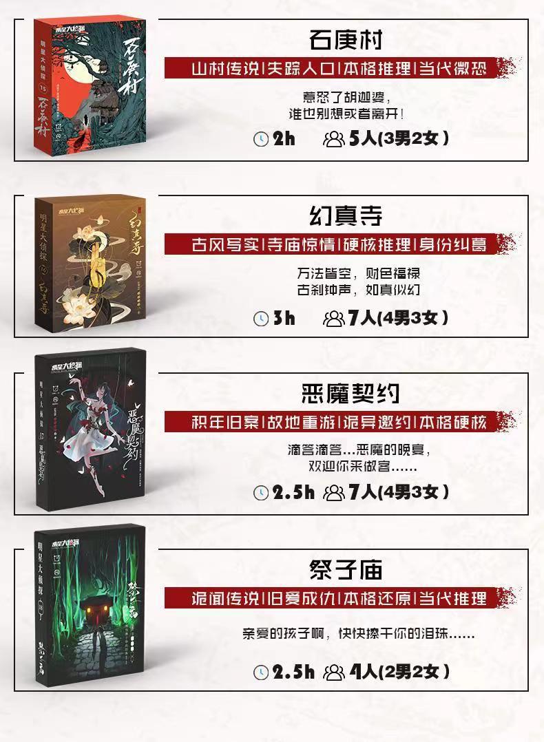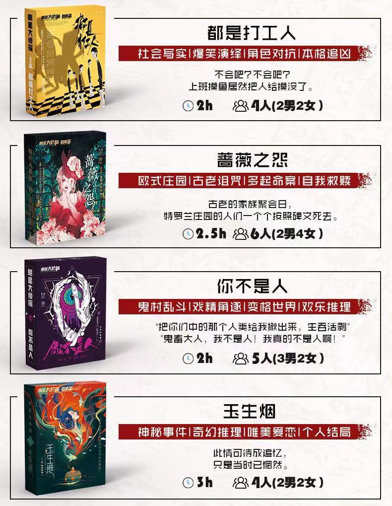カラー 春日宴【5人で遊ぶ】,玉生煙【4人で遊ぶ】,あなたは人ではない【5人で遊ぶ】,官海浮沈【6人で遊ぶ】,人魚の涙【6人で遊ぶ】,薔薇の怨み【6人本】,未知の旅【6人本】,幻真寺【7人本】,陶宅夜話【2人本】,壁のすぐ【5人本】,ハイアールポープ【6人本】,白府惊云【4人本】,2の8乗【1から5人本】,嘘城【6人本】