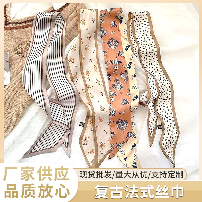 レトロなフランスのシルクタオルのヘアバンドの新しい長条のシルクタオルの女性の百合の長条の編みの髪は馬尾のヘアバンドのリボンのスカーフを結びます。