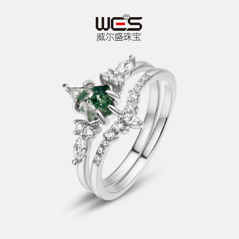 亚马逊跨境新品 天然绿苔藓石水草玛瑙高品质女士两件套结婚戒指