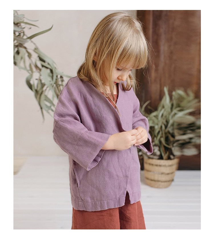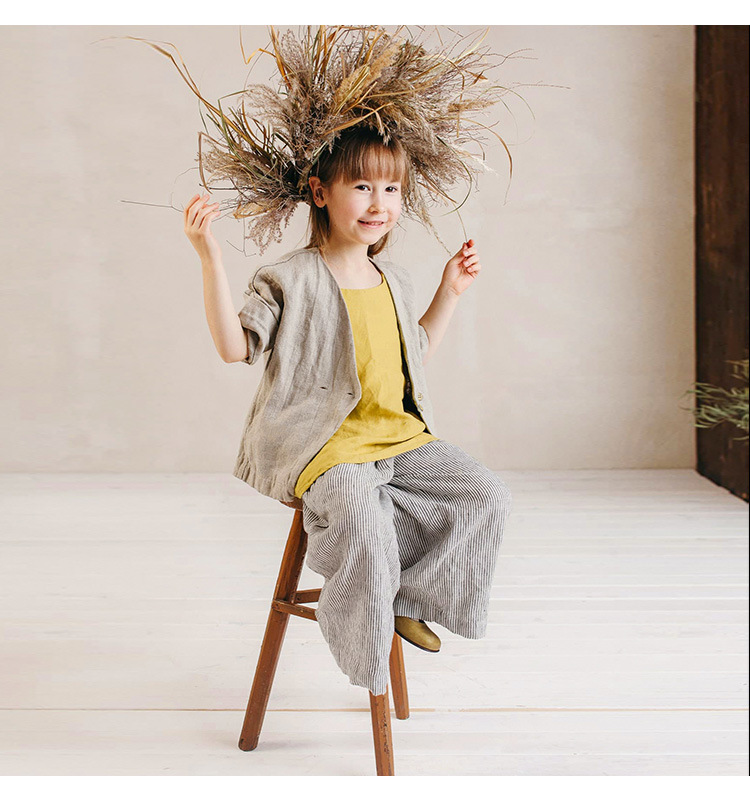 春と秋の綿とリネンのTシャツ子供服クロスボーダーハーフオープンカラー長袖トップス男性と女性のベビーフォレスト長袖リネンシャツ