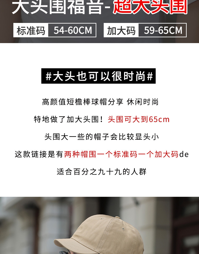 帽子男短帽檐大头围棒球帽男款鸭舌帽硬顶短舌5cm大码纯棉潮帽