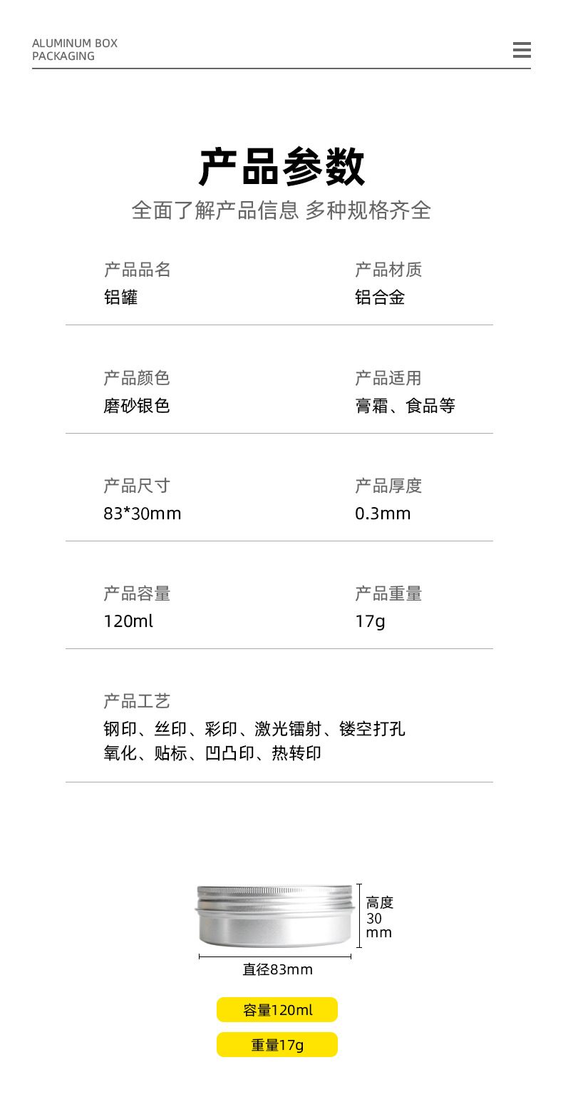 人気商品 120ml83*30 アルミボックス 茶葉・キャンディー用ねじ込み式密封アルミボックス包装 化粧品・クリーム・乳液用