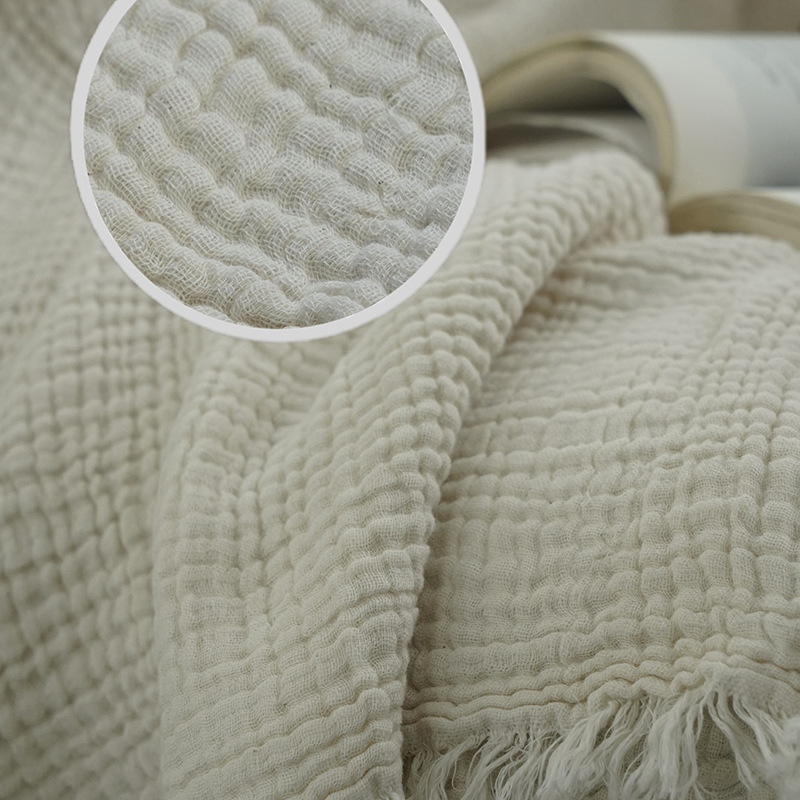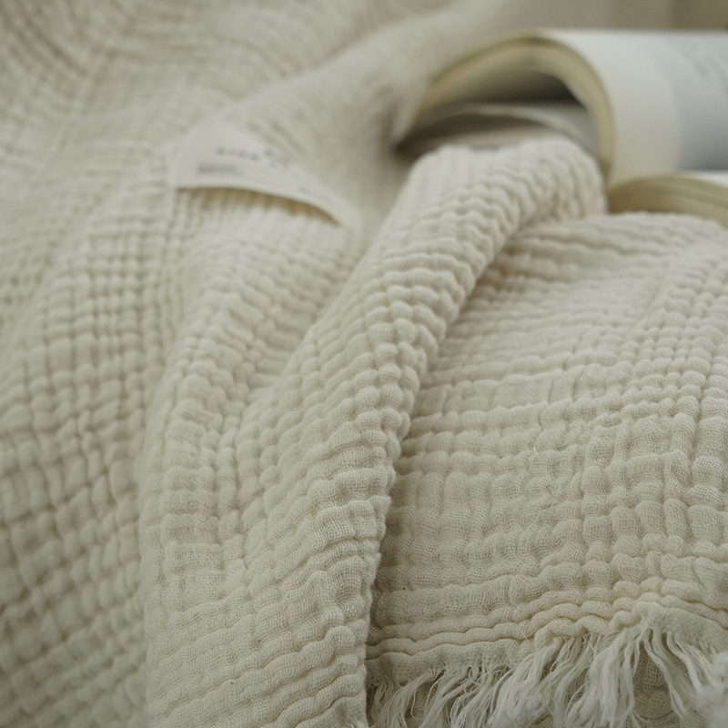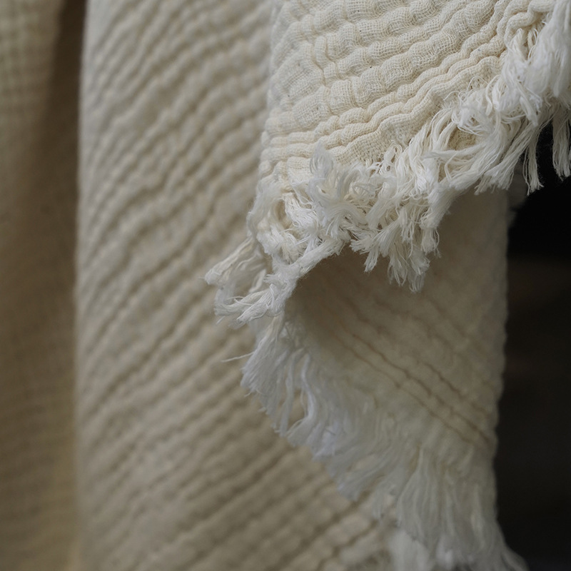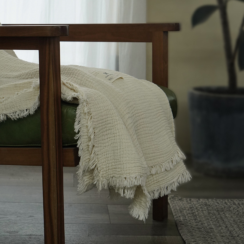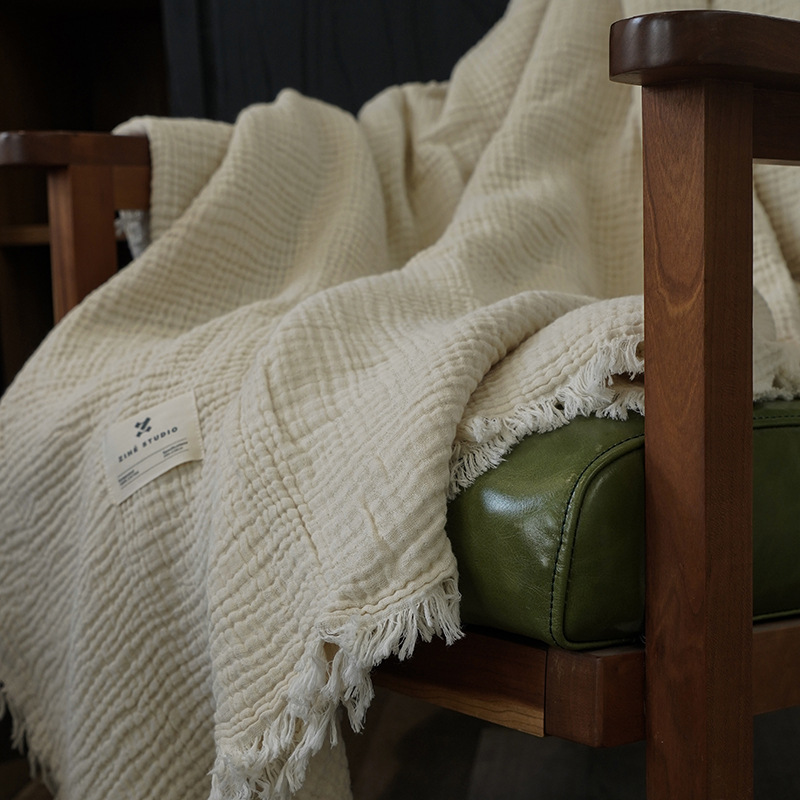 关键词:全棉、四层纱,浓郁沉稳的色彩,四边流苏,褶皱感超强,松软、厚糯、亲肤。
