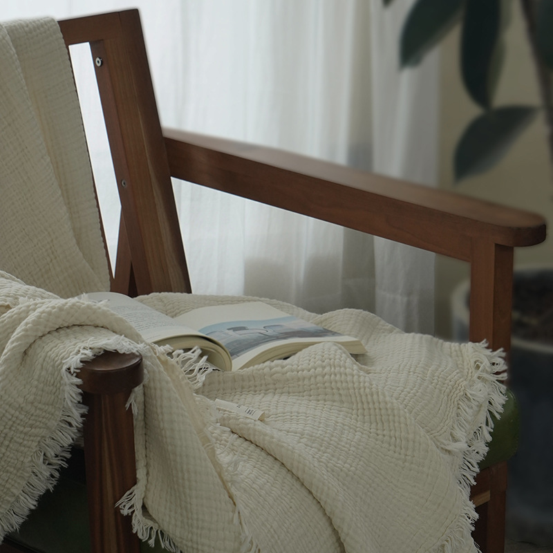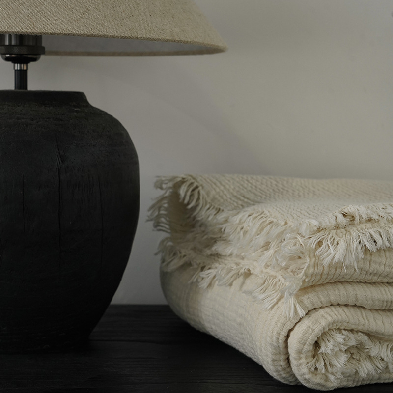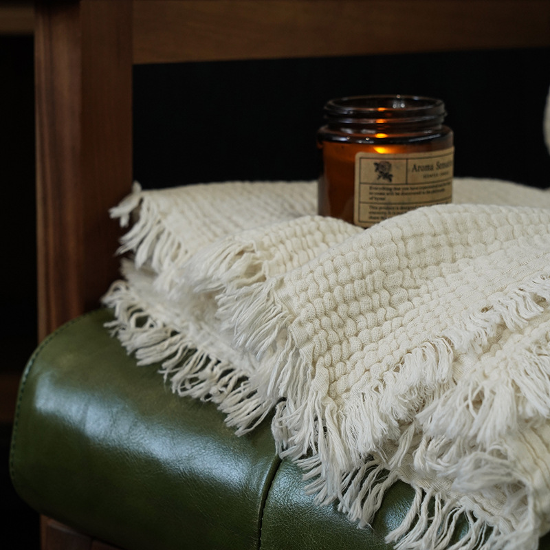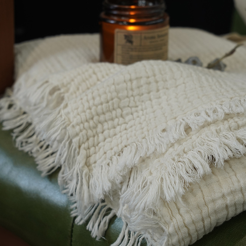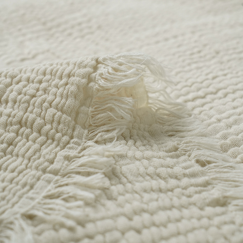 关键词:全棉、四层纱,浓郁沉稳的色彩,四边流苏,褶皱感超强,松软、厚糯、亲肤。