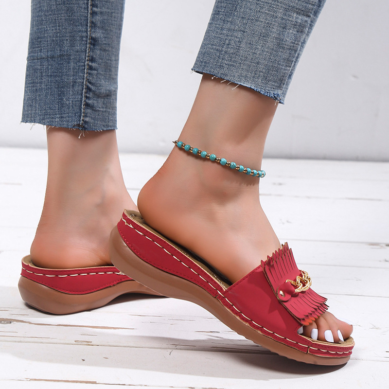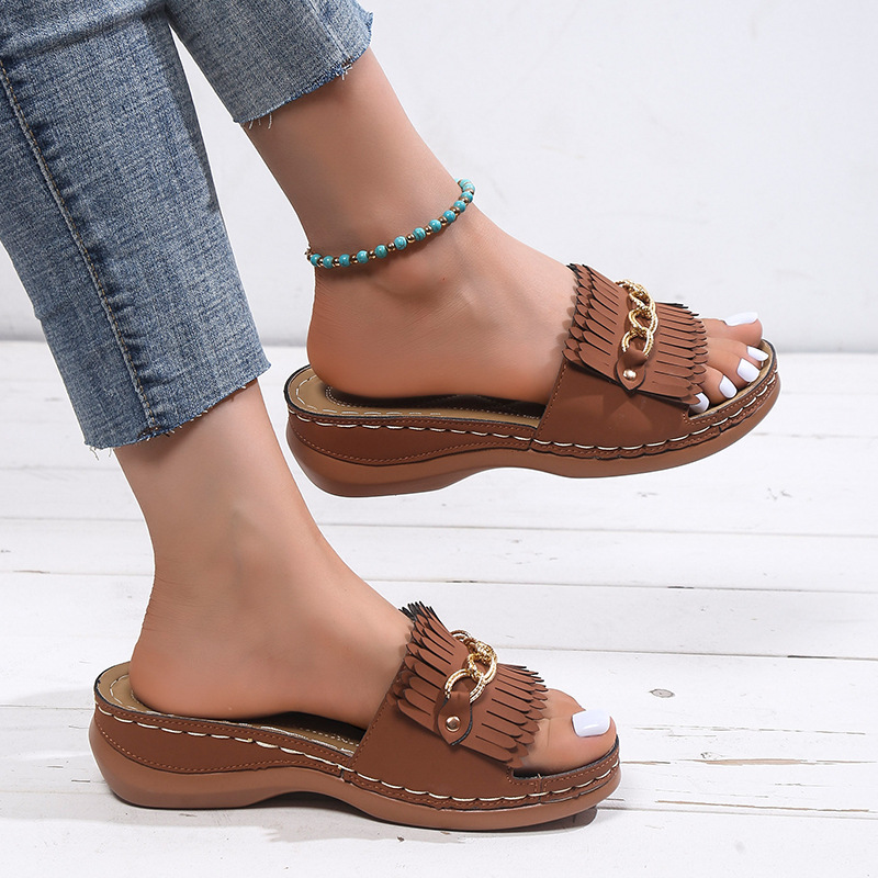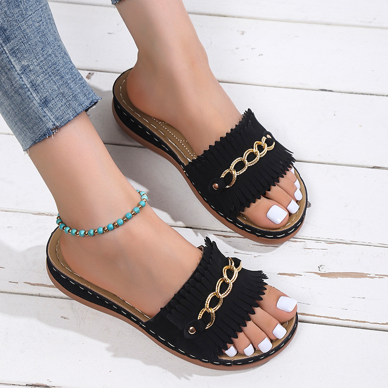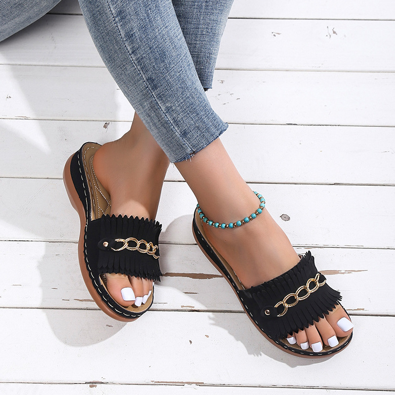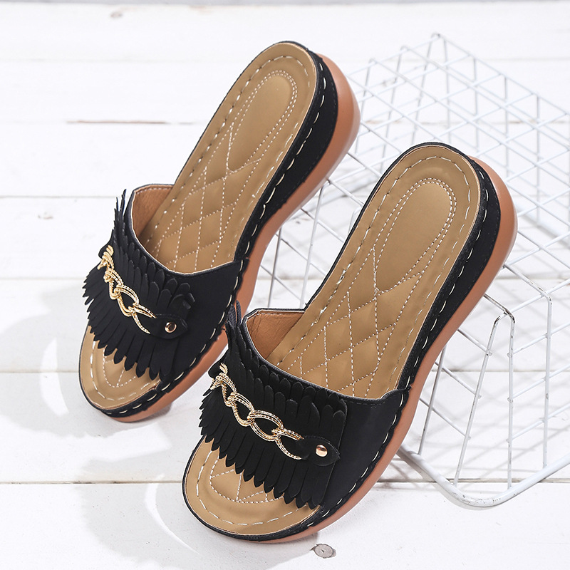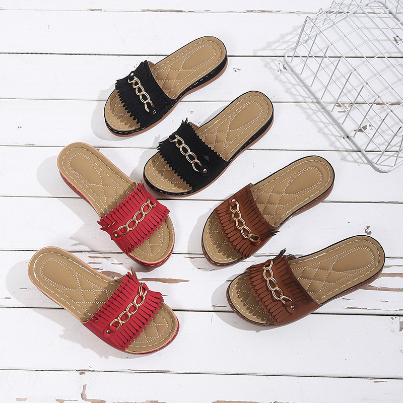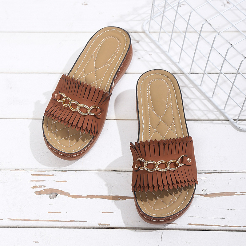 クロスボーダーの外国貿易の大きいサイズの坂とチェーンの1字のスリッパの女性の外は厚い底のフリンジビーチのサンダルのslippersを着ます。
