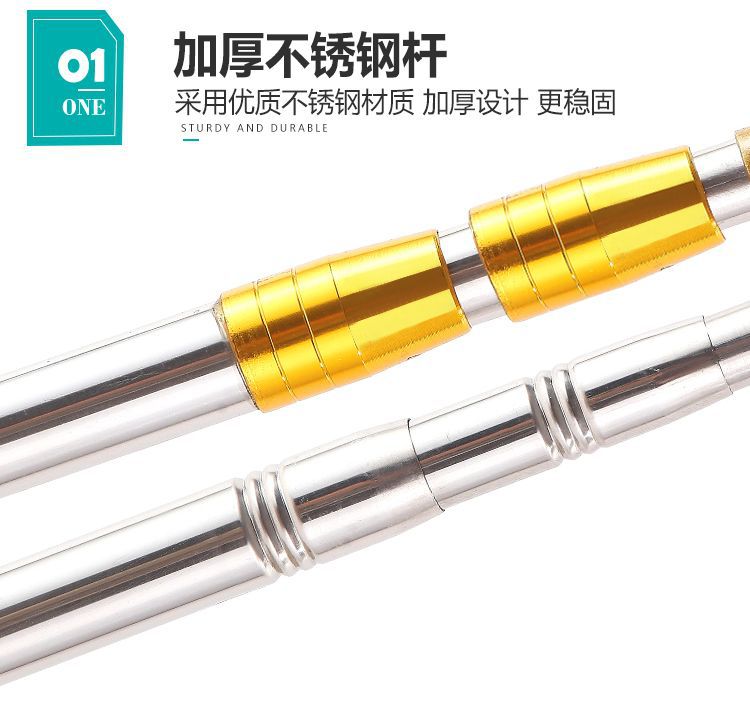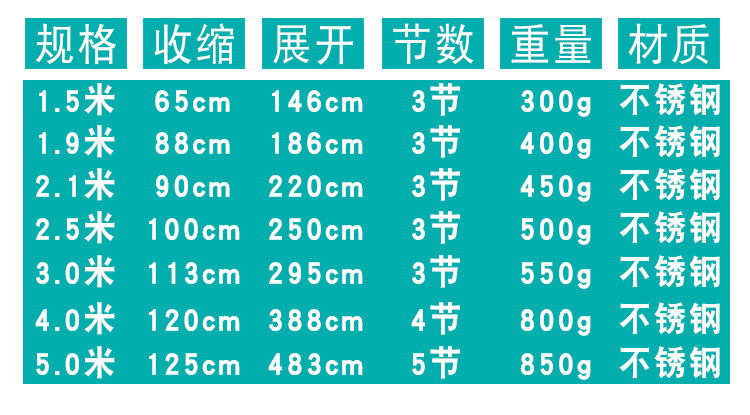 仕様 1.2メートル (71cm-118cm 2節収縮),1.5メートル (65cm -- 150cm 3本収縮),1.7メートル (77cm -- 170cm三節収縮),1.9メートル (88cm -- 190cm三節収縮),2.1メートル (90cm -- 210cm三節収縮),2.5メートル (100cm-250cm三節収縮),3メートル (113cm-300cm三節収縮),4メートル120cm-400cm四節収縮),5メートル (125cm-500cm五節収縮),1.5メートル (85cm -- 150cmの二つの収縮),6メートル (140cm-600cm五節収縮)