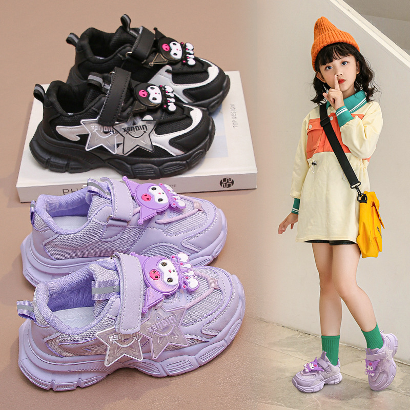 女の子のネットの顔の運動靴の2025春秋の新型のアニメのファッションの柔らかい底の滑り止めの中で大きい子供の百合のカジュアルな靴