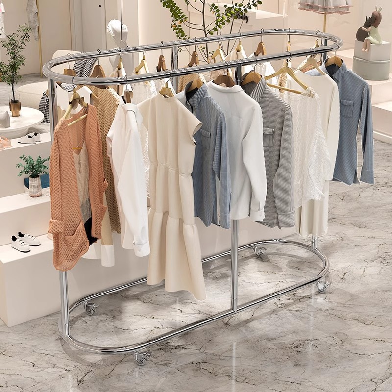 衣料品店のディスプレイラックステンレス鋼洋服ラック楕円形アイランドラック棚婦人服子供服ラック床ディスプレイラック