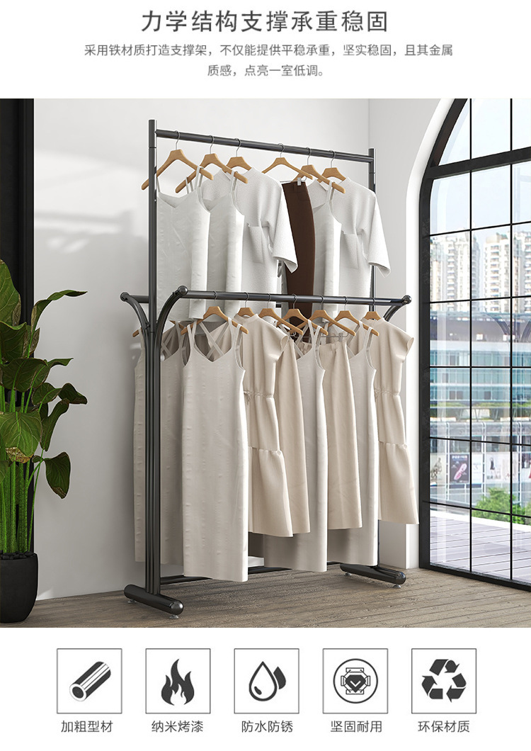 洋服店二重展示棚上下昇降式ハンガー床置き式洋服棚移動車輪付き