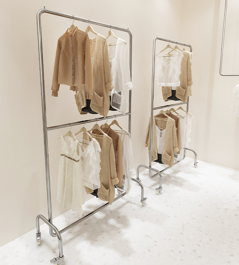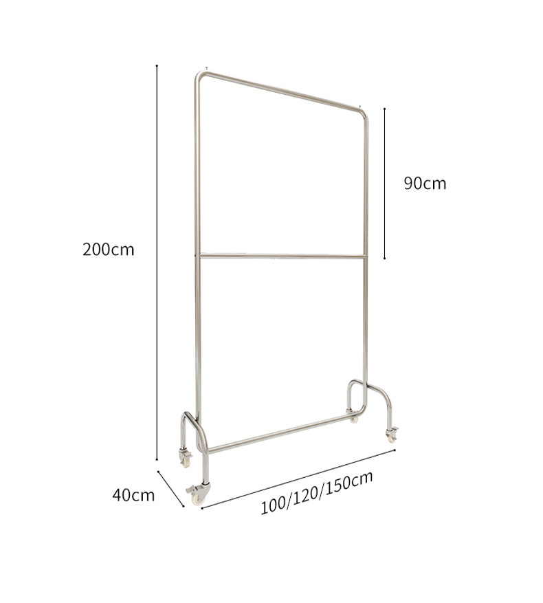 衣料品店のディスプレイラック ステンレス製二層衣類ラック 可動式ディスプレイラック 衣類ラック ホイール付きフロア衣類ラック