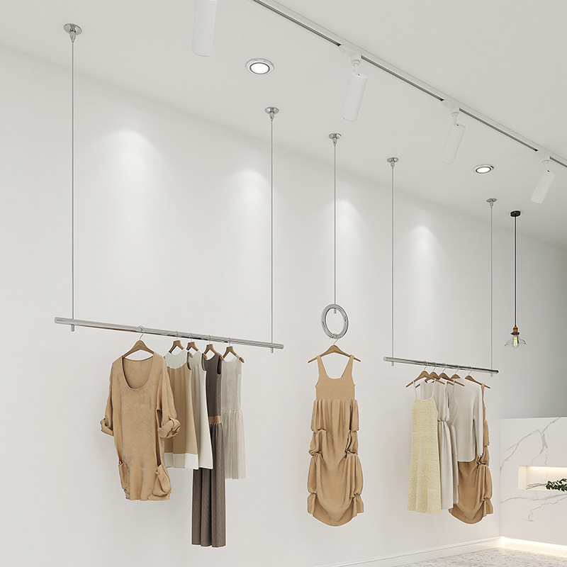 衣料品店ステンレス伸線銀色展示棚二重フロア男女子供服昇降調節プーリーハンガー