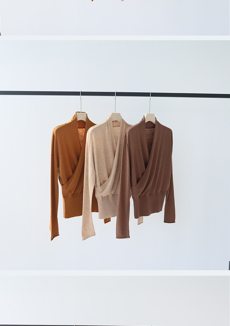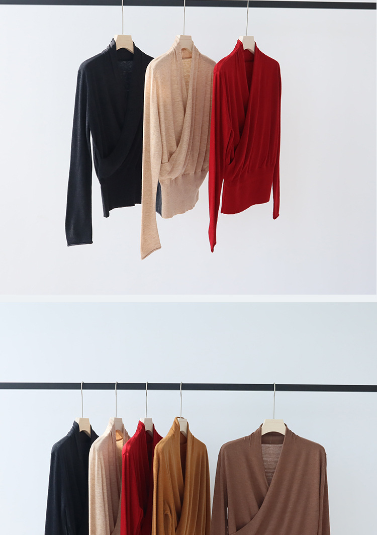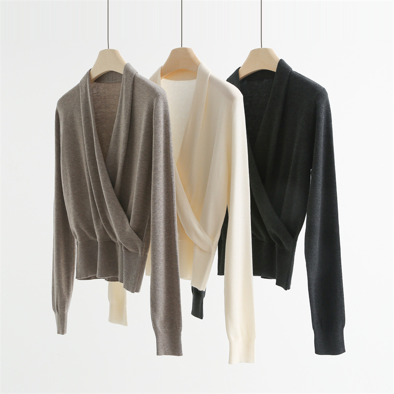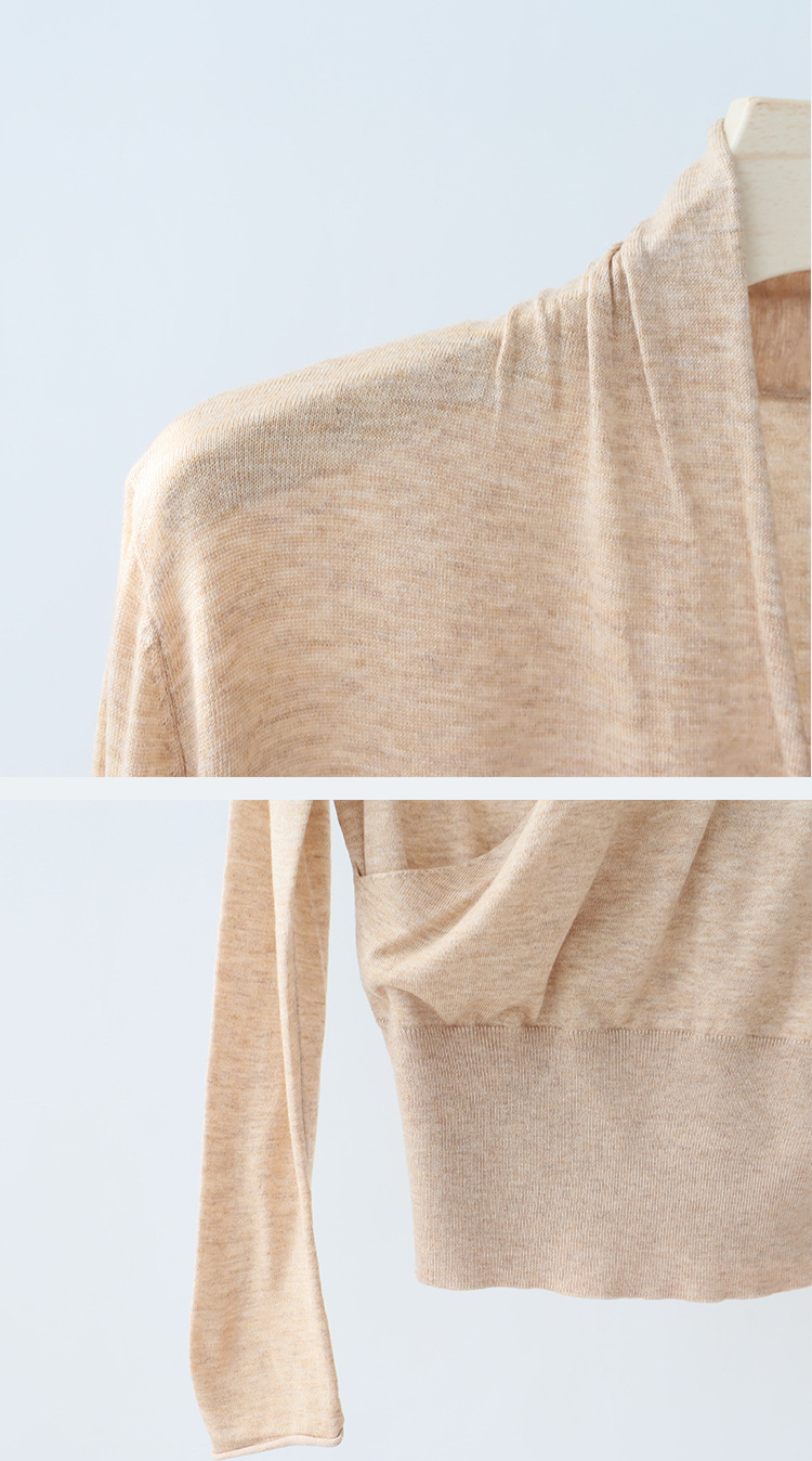リヨセルテンセル春夏クロスストラップシンプルスタイルニットセーターレディース長袖Vネックエアコンシャツストラップデザイン