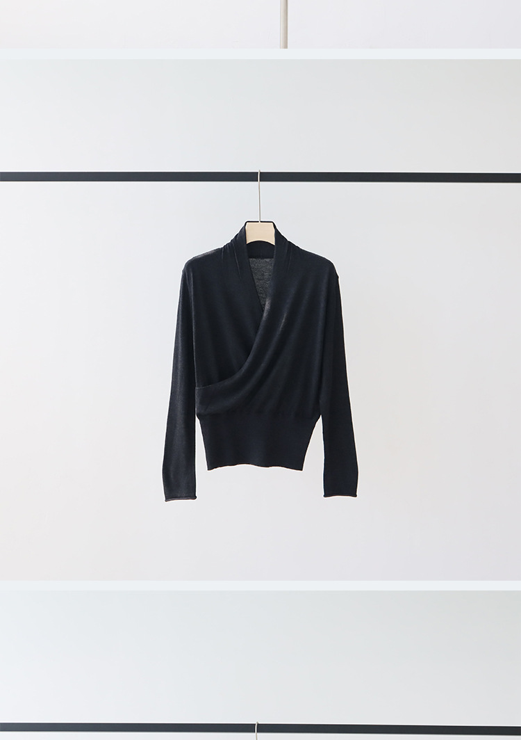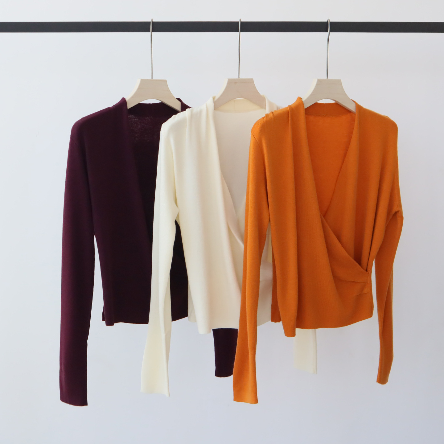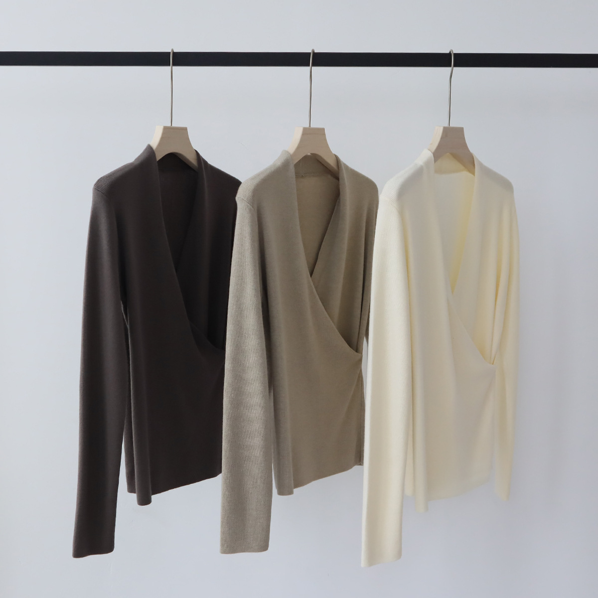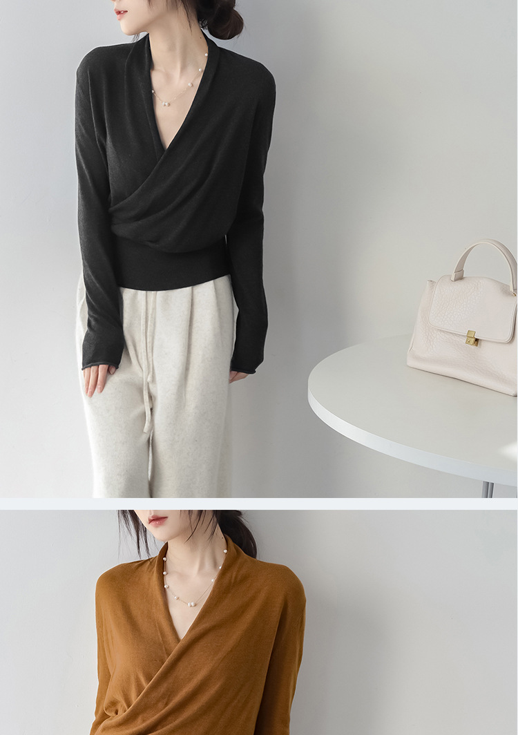 羊毛混纺秋季上衣高级感交叠V领针织衫长袖打底衫毛衣设计感女装