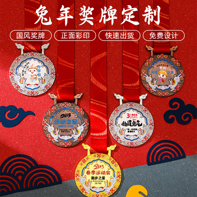 ウサギの年の新型の国風のメダルはアイデアの高級な学校の運動会のマラソンの試合の金メダルを注文して注文します。