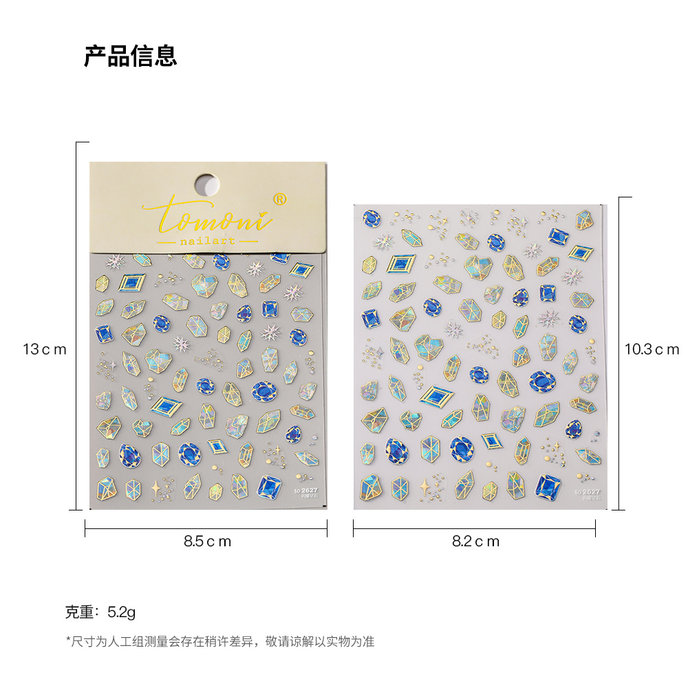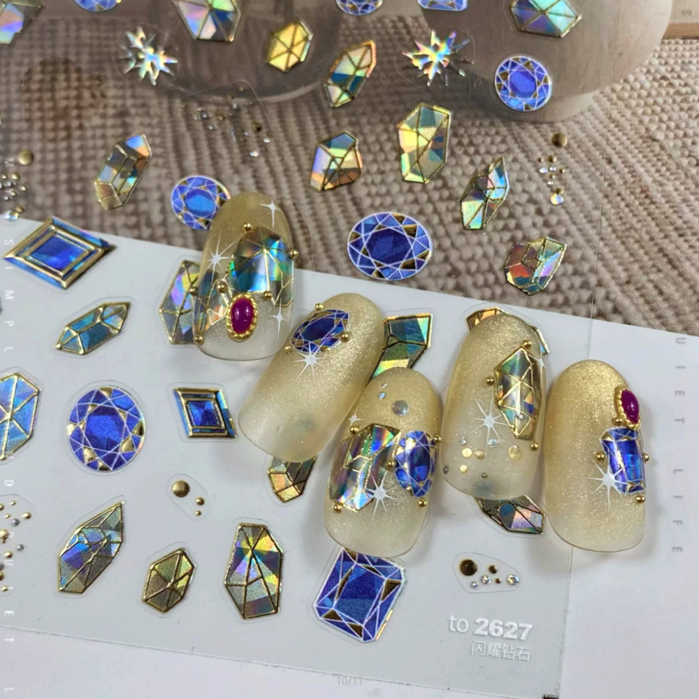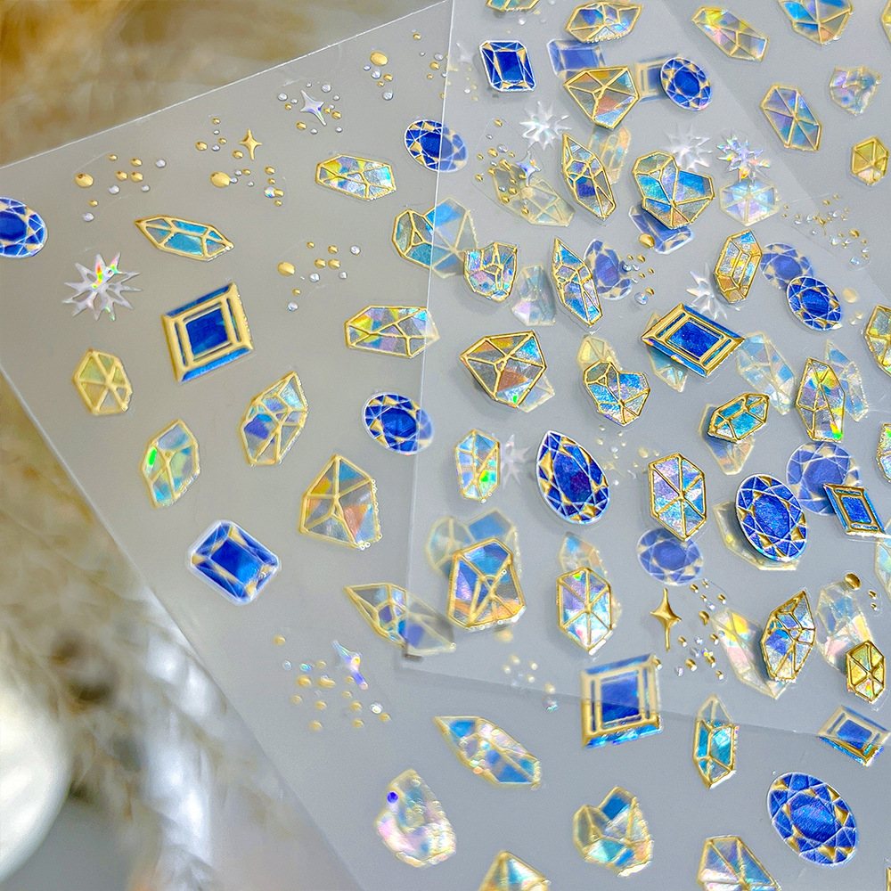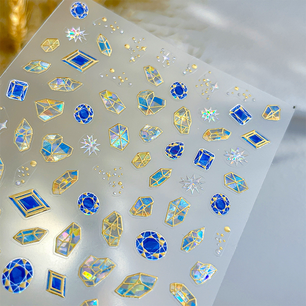 レーザー輝くダイヤモンドのネイルシールの浮き彫り金の縁の青い輝く宝石のバックゴムの爪の装飾品の卸売り